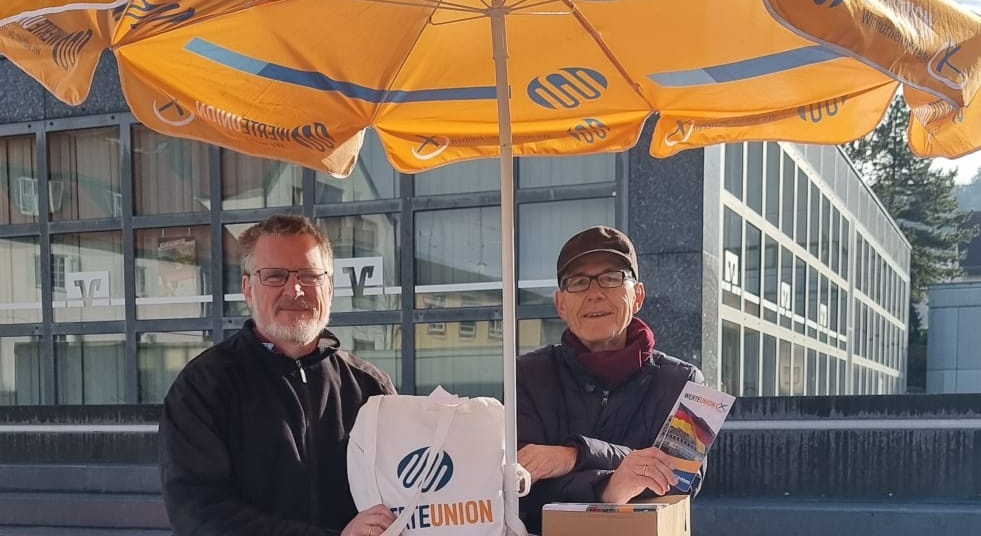 Zwischen Trumpf-Maschinen und Bürger-Maultaschen darf man in Gerlingen die WerteUnion nicht vergessen. Der ohnehin schon extrem aktive Kreisverband Ludwigsburg/Rems-Murr, zu dem auch Gerlingen gehört, war auch dieses Wochenende wieder „uff d’r Gass“ (wie man im Schwäbischen sagt). Helge de Boer warb mit Dr. Werner Huber für die Partei und sammelte nebenbei auch noch Unterstützerunterschriften, die wir dringend brauchen, um an der Wahl teilnehmen zu dürfen. Danke an Helge de Boer und sein Team!
